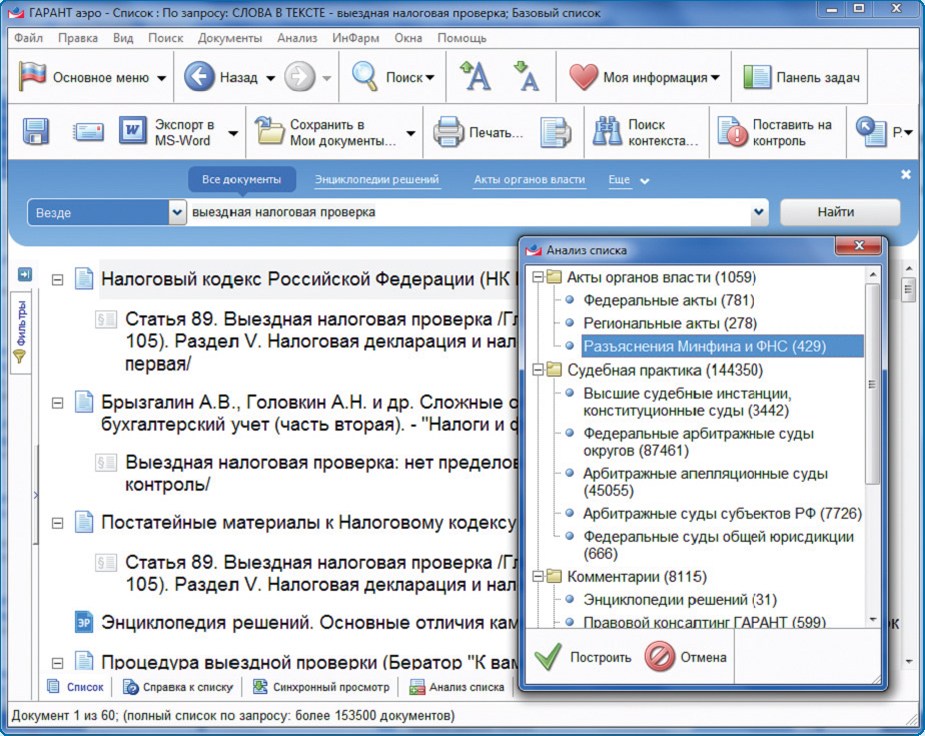 1. Для обеспечения единообразного проведения выездных налоговых проверок ФНС России разработала специальные рекомендации. Чтобы найти данный документ в системе ГАРАНТ, в строку Базового поиска начните вводить выездная и из Словаря популярных запросоввыберите выездная налоговая проверка. Воспользуйтесь удобной функцией Анализ списка, чтобы оставить в полученном списке документы, изданные ФНС России. Для этого нажмите расположенную в нижней части экрана вкладку