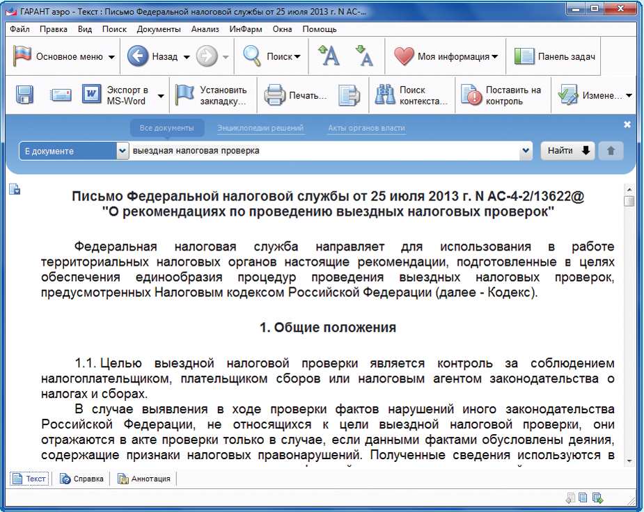 2. Откройте в полученном списке первый документ – письмо Федеральной налоговой службы от 25 июля 2013 г. № АС-4-2/13622@ «О рекомендациях по проведению выездных налоговых проверок». В нем детально прописан порядок проведения выездной налоговой проверки, перечислены определенные ограничения при их проведении, уделено внимание месту, сроку, окончанию проверки, порядку вручения итогового акта проверяемому лицу. Отдельно отмечены выездные налоговые проверки, проводимые независимо от времени и предмета предыдущих проверок (рис. 2).