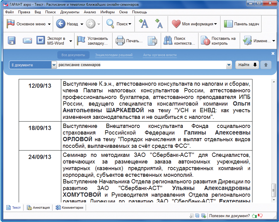 4. Чтобы ознакомиться с расписанием и тематиками ближайших семинаров, в строку Базового поиска введите расписание и из Словаря популярных запросов выберите расписание семинаров. В полученном списке откройте первый документ (рис. 3).