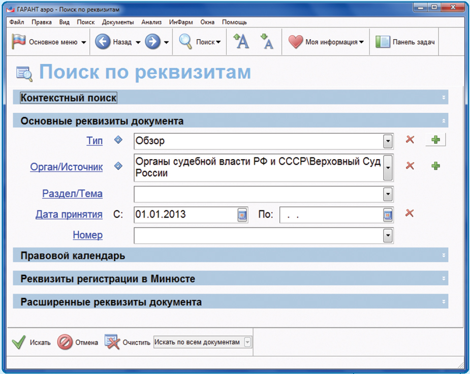 4. В открывшейся карточке Поиска по реквизитам требуется только ввести необходимые данные, затем осуществить поиск, после чего можно изучать судебные решения по интересующему вопросу. Работать с документами в онлайн-архиве так же просто и удобно, как и с любыми другими материалами системы ГАРАНТ. Здесь доступны все необходимые поисковые и аналитические возможности для эффективной работы с правовой информа-цией.