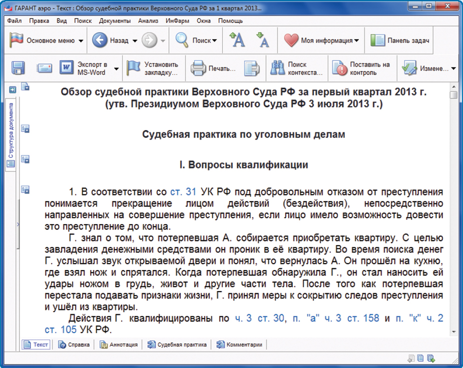 2. Откройте в полученном списке первый документ – обзор судебной практики Верховного Суда РФ за I квартал 2013 года. Из его текста можно узнать следующее: время нахождения лица под подпиской о невыезде не может быть зачтено в срок наказания в виде лишения свободы; наличие малолетнего ребенка у виновного само по себе не может рассматриваться как безусловное смягчающее обстоятельство. Отмечено также, что факт владения