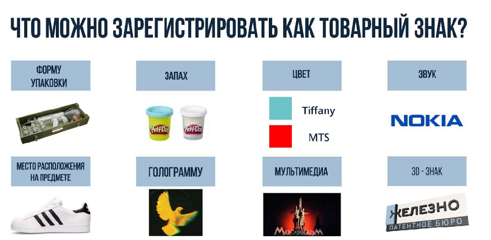 Выше мы рассматривали только названия и логотипы, но на самом деле видов товарных знаков намного больше.