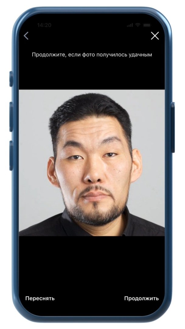 Пользуясь подсказками приложения, сделать фото своего лица. Чтобы фотография получилась и успешно прошла проверку, нужно обеспечить хорошее освещение и фотографироваться на нейтральном фоне. Лицо должно быть полностью в кадре. Головной убор нужно снять, волосы убрать так, чтобы они не загораживали лицо.