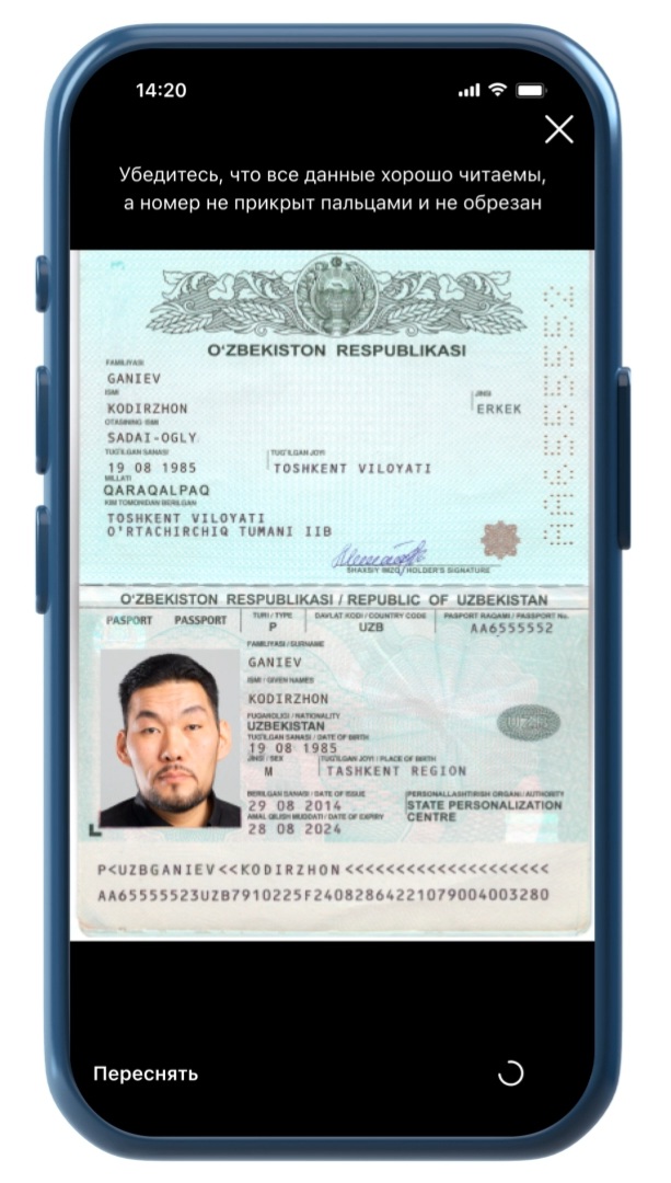 Сфотографировать паспорт, который использовался при регистрации в приложении.