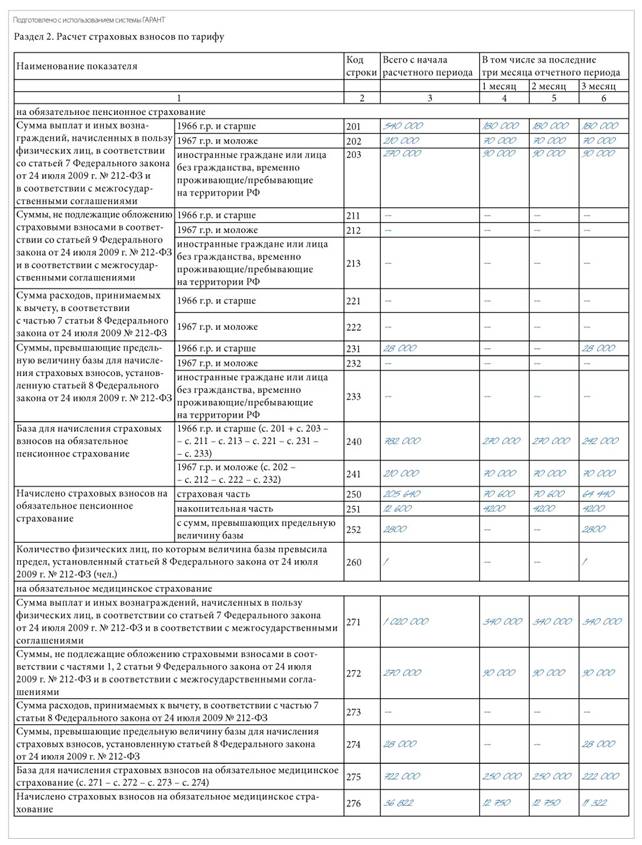 Существенные изменения претерпел раздел 2. Во первых, его разбили на две части: расчет страховых взносов на обязательное пенсионное страхование (ОПС) и на обязательное медицинское страхование (ОМС). Каждая часть дополнена новыми строками. Так, в расчет страховых взносов на ОПС внесли данные по временно пребывающим иностранцам и строку 252, в которой указывают, сколько начислено взносов с сумм, превышающих предельную величину базы. Кроме того, в отдельной строке (260) бухгалтеру теперь нужно показывать количество работников, у которых эта величина превышена.