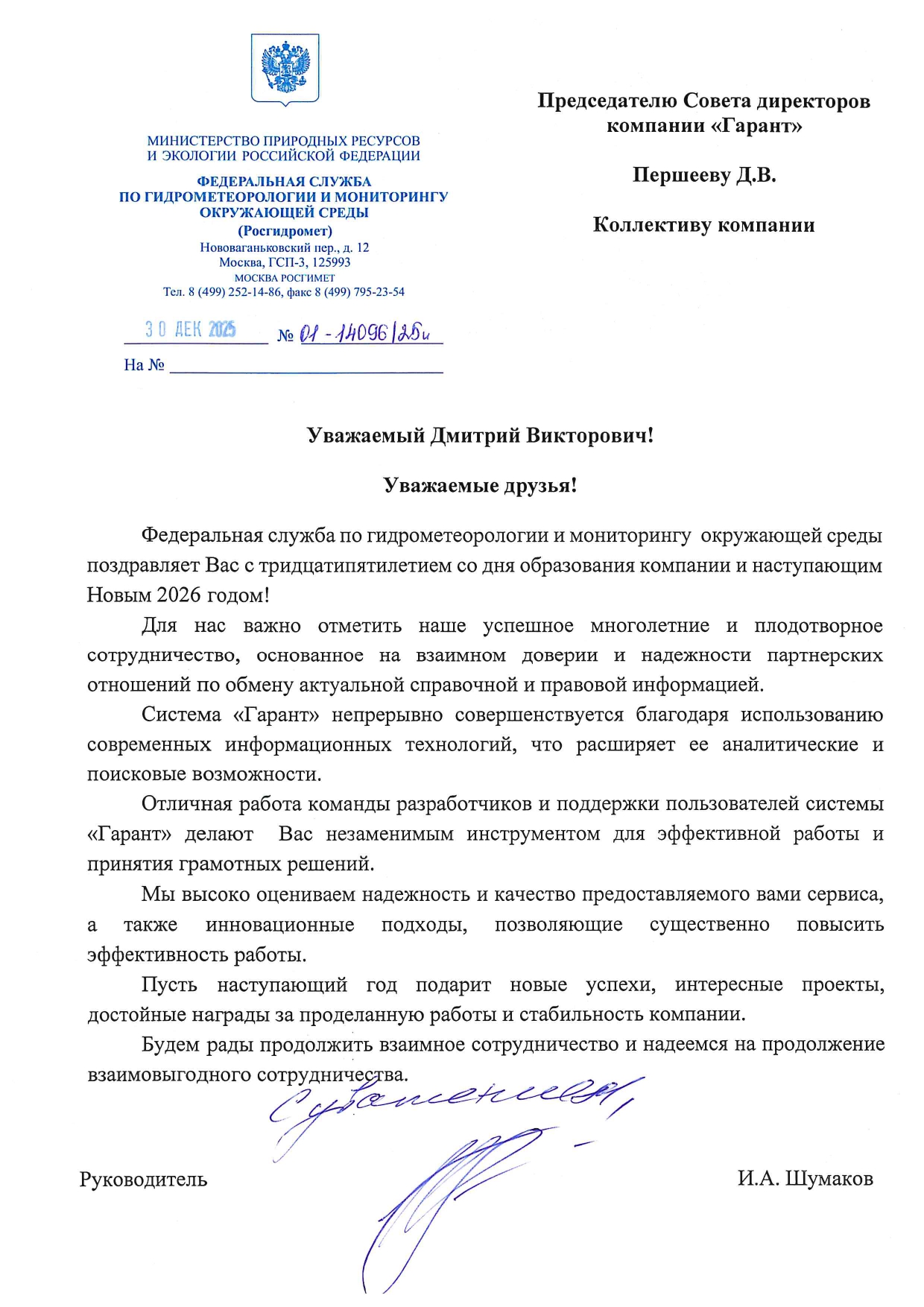Росгидромет поздравил компанию "Гарант" с 35-летием