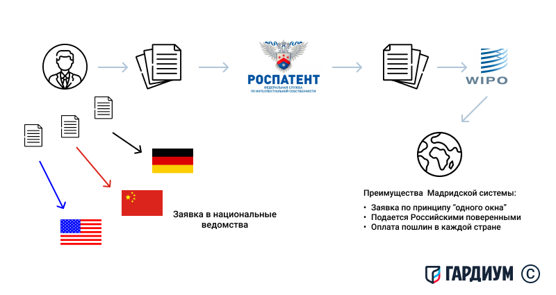 Работает принцип «одного окна»: есть общий регистрационный орган, который отвечает за подачу заявок в каждую из стран-участниц. Например, для самой крупной в мире — Мадридской системы, это Всемирная организация интеллектуальной собственности (ВОИС). Через нее можно пройти регистрацию товарного знака в любой из 124 стран, подписавших соглашение.