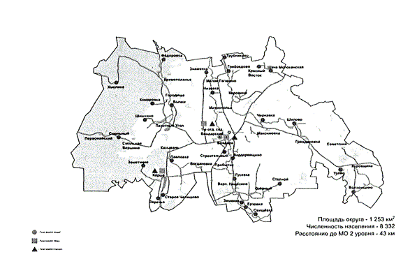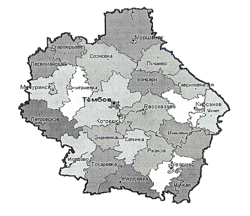 Общая площадь территории Тамбовской области составляет 34461 кв. км. Тамбовская область включает в себя 7 городских округов: г. Тамбов, г. Кирсанов, г. Котовск, г. Мичуринск, г. Моршанск, г. Рассказово, г. Уварово и 23 муниципальных округа: Бондарский, Гавриловский, Жердевский, Знаменский, Инжавинский, Кирсановский, Мичуринский, Мордовский, Моршанский, Мучкапский, Никифоровский, Первомайский, Петровский, Пичаевский, Рассказовский, Ржаксинский, Сампурский, Сосновский, Староюрьевский, Тамбовский, Токаревский, Уваровский, Уметский (рис. 1).