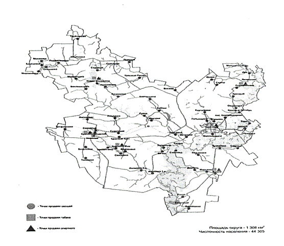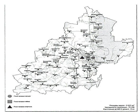 Карта точек продажи овощей, табака, спиртного и расположения объектов спортивной инфраструктуры в Уметском муниципальном округе