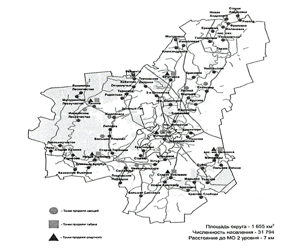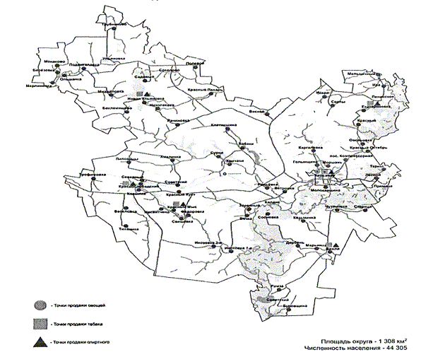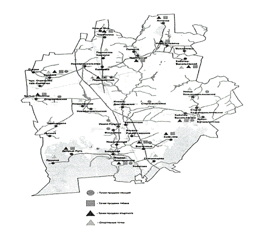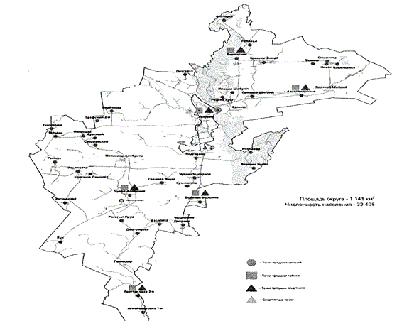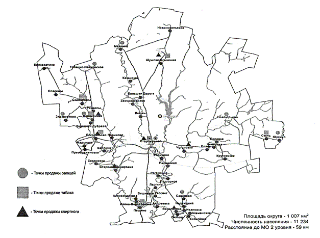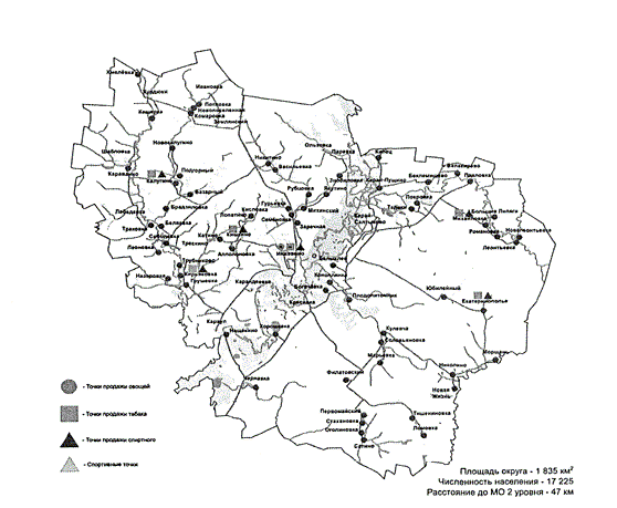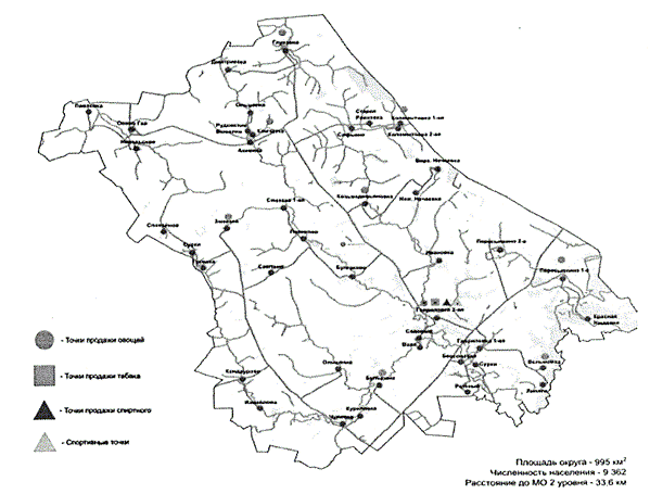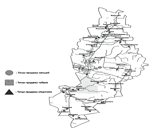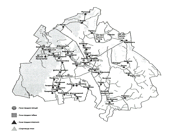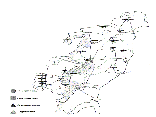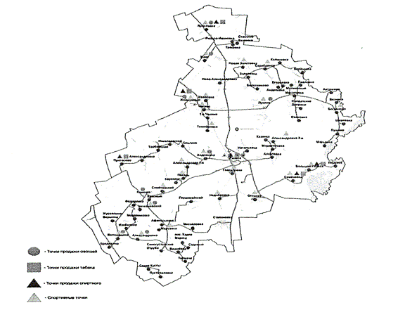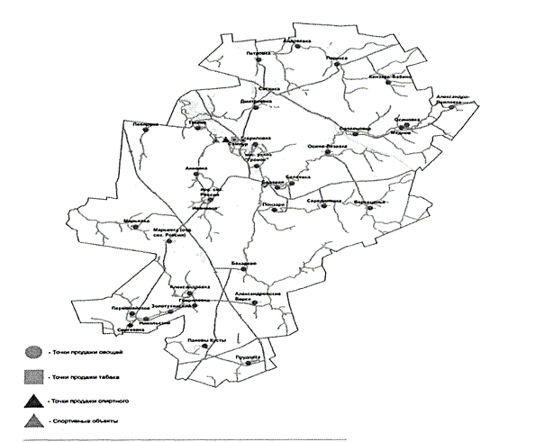 Карта точек продажи овощей, табака, спиртного и расположения объектов спортивной инфраструктуры в Староюрьевском муниципальном округе
