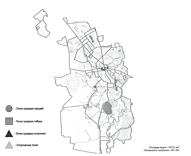 Карта точек продажи овощей, табака, спиртного и расположения объектов спортивной инфраструктуры в Первомайском муниципальном округе
