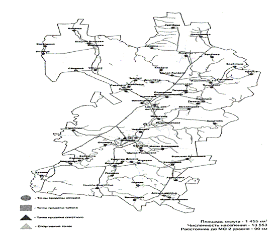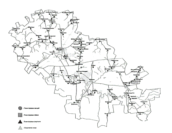 Карта точек продажи овощей, табака, спиртного и расположения объектов спортивной инфраструктуры в Сампурском муниципальном округе