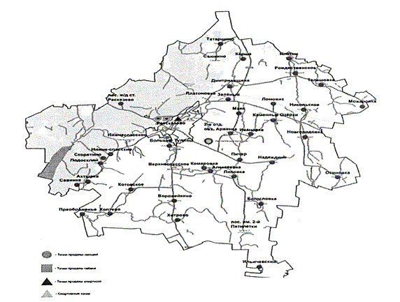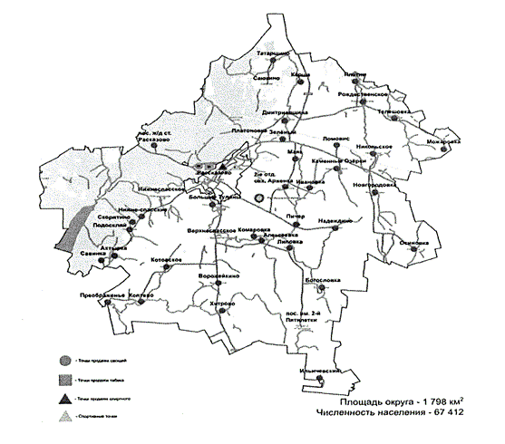 Карта точек продажи овощей, табака, спиртного и расположения объектов спортивной инфраструктуры в Рассказовском муниципальном округе