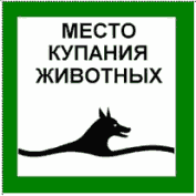 3. | Место купания животных (с указанием границ в метрах) | в зеленой рамке. Надпись сверху. Ниже изображена плывущая собака. Знак укрепляется на столбе белого цвета |