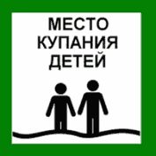 2. | Место купания детей (с указанием границ в метрах) | в зеленой рамке. Надпись сверху. Ниже изображены двое детей, стоящих в воде. Знак укрепляется на столбе белого цвета |