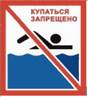 4. | Купаться запрещено (с указанием границ в метрах) | в красной рамке, перечеркнутой красной чертой по диагонали с верхнего левого угла. Надпись сверху. Ниже изображен плывущий человек. Знак укрепляется на столбе красного цвета |