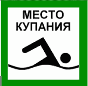 1. | Место купания (с указанием границ в метрах) | в зеленой рамке. Надпись сверху. Ниже изображен плывущий человек. Знак укрепляется на столбе белого цвета |