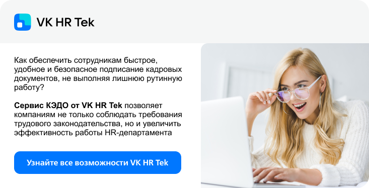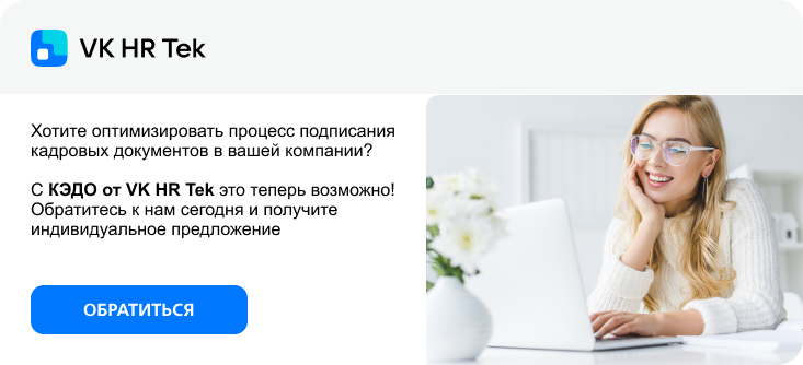 Оцифруйте кадровый документооборот вместе с VK HR Tek. Узнайте, как сократить расходы и время на ведение КЭДО на бесплатной демо-встрече.