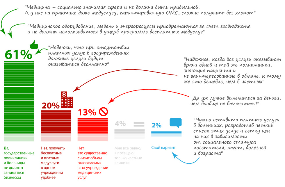 61% опрошенных считают, что государственные поликлиники и больницы не должны оказывать платные медицинские услуги