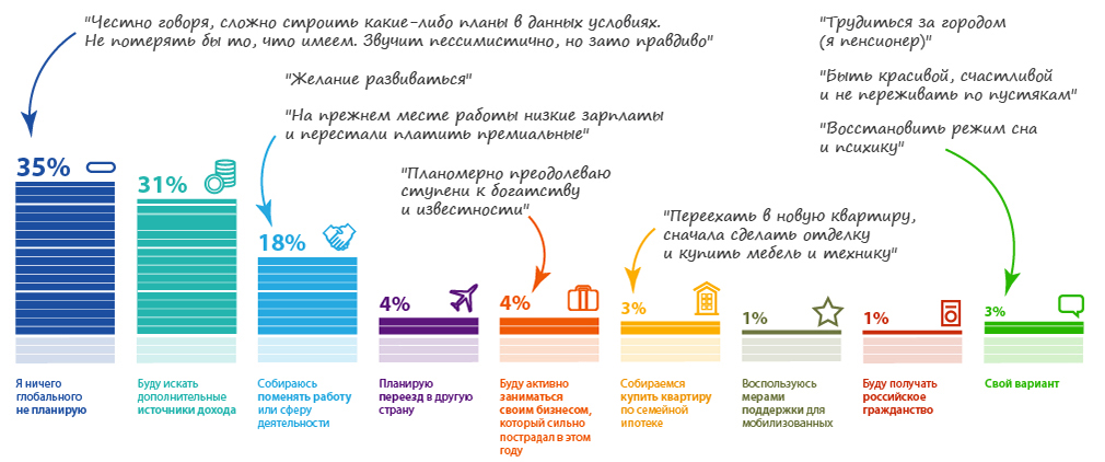 В начале нового года принято составлять планы, которым граждане будут следовать весь год. Наиболее популярным ответом стало отсутствие глобальных планов в 2023 году. Интересно, что годом ранее информационно-правовой портал ГАРАНТ.РУ также проводил соответствующий опрос читателей. Тогда количество респондентов, предположивших, что в новом году их не ожидает ничего глобального, было близким к значению этого года – 36% к 35%. Смена профессии стала вторым по популярности вариантом ответа в прошлом году – такое желание изъявили 24%. Тройку рекордсменов закрыл вариант с глобальной сменой места жительства – в начале 2022 года о таких намерениях заявили 11% читателей портала. На 2023 год переезд планирует всего 4% респондентов.