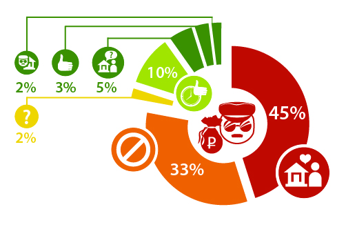 78% опрошенных высказались отрицательно. Из них 45% отметили, что, заключая кредитный договор, хотели бы все вытекающие из него отношения строить напрямую с банком. Так, среди аргументов встречаются такие как: "Не нравится, когда мои личные данные есть неизвестно у кого, и когда мне звонит неизвестно кто…", или "…коллектор находится неизвестно где и заплатить ему иногда очень проблемно…". Оставшиеся 33% отметили, что в институте коллекторства просто нет необходимости, он создает лишние проблемы и гражданам, и госорганам. В частности, участники опроса отмечали, что "подменять службу судебных приставов нет необходимости", "коллекторские агентства действуют на грани закона".