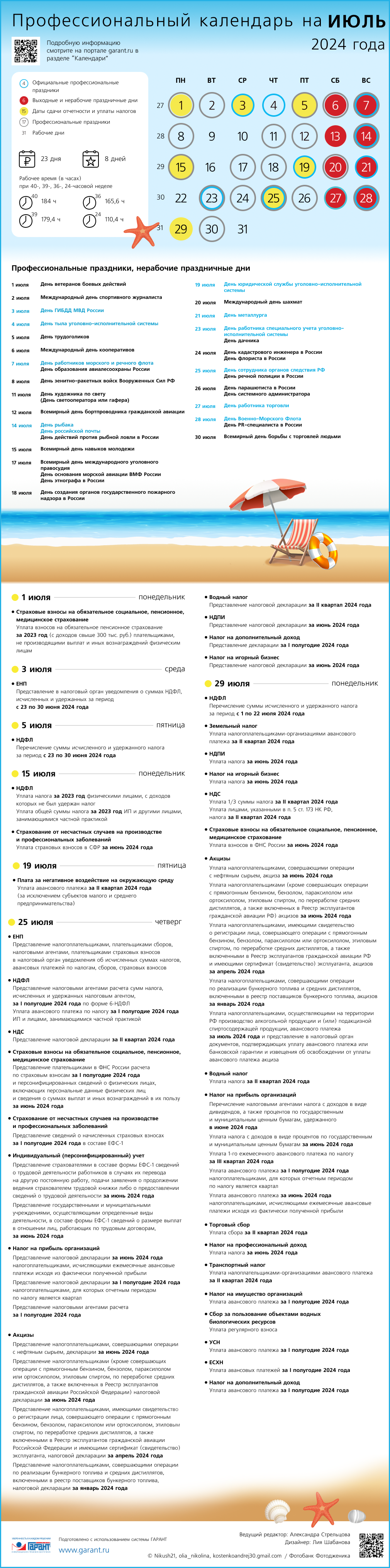 В июле 2024 года нас ожидают 23 рабочих дня и 8 выходных. В этом месяце мы отмечаем ряд праздников, в том числе профессиональных: