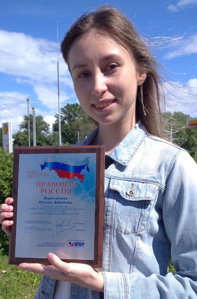| ПЕРЕВЕЗЕНЦЕВА НАТАЛЬЯ ДМИТРИЕВНА г. Санкт-Петербург Студентка бакалавриата Лауреат Конкурса (III место) в номинации "Правовая надежда России". |