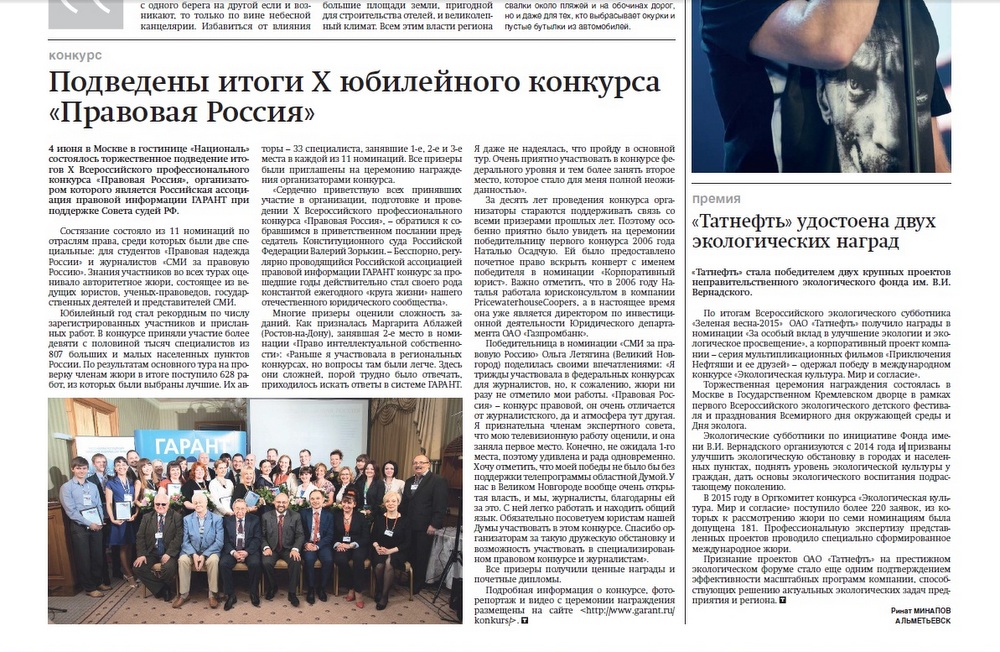 4 июня в Москве в гостинице «Националь» состоялось торжественное подведение итогов X Всероссийского профессионального конкурса «Правовая Россия», организатором которого является Российская ассоциация правовой информации ГАРАНТ при поддержке Совета судей РФ.