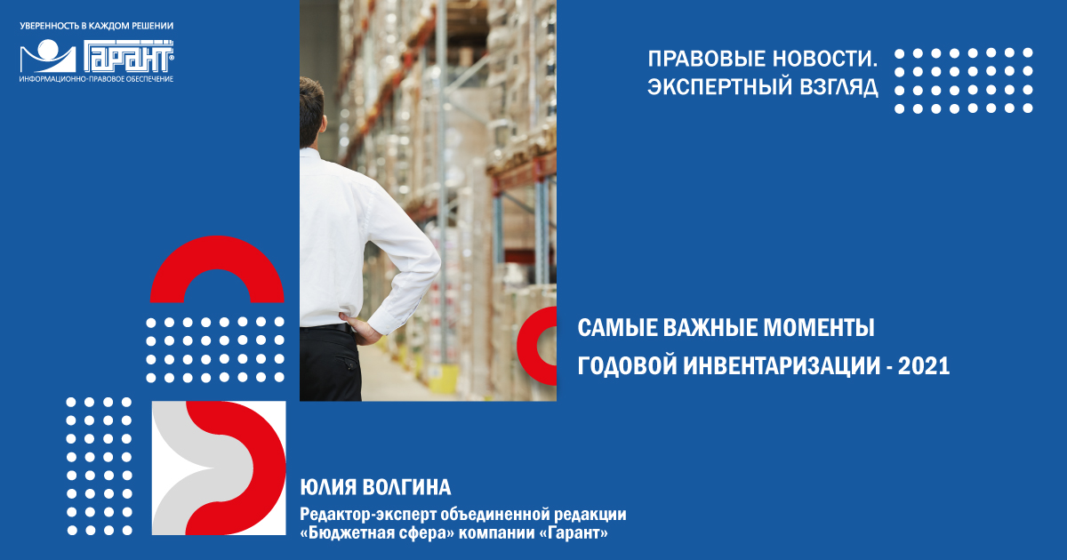 До представления годовой бухгалтерско-бюджетной отчетности необходимо провести инвентаризацию. Какие требования предъявляются к инвентаризации? Как их учесть, чтобы результаты были признаны достоверными? Юлия Волгина, редактор-эксперт объединенной редакции "Бюджетная сфера" компании "Гарант", расскажет о ключевых нюансах проведения инвентаризации в 2021 году.