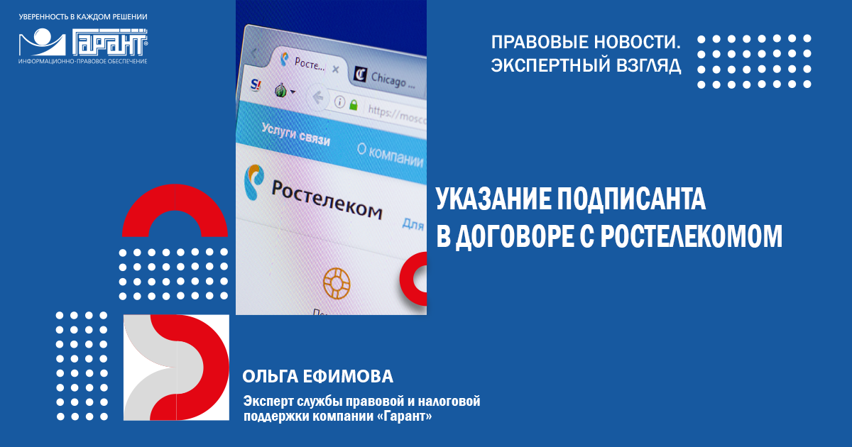 Ростелеком настаивает на том, что в преамбуле электронного договора можно не указывать сведения о лице, которое подписывает договор, и документе на основании, которого он действует. Так ли это? Разъяснения подготовила эксперт службы Правового консалтинга ГАРАНТ Ольга Ефимова.