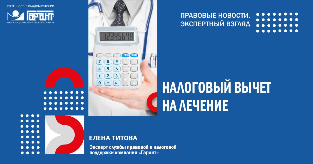 Налоговый вычет за лечение – это возврат части ранее уплаченного в бюджет НДФЛ. Кто может получить такой вычет, в какой сумме, и что нужно сделать для его получения – об этом расскажет эксперт службы Правового консалтинга ГАРАНТ Титова Елена.