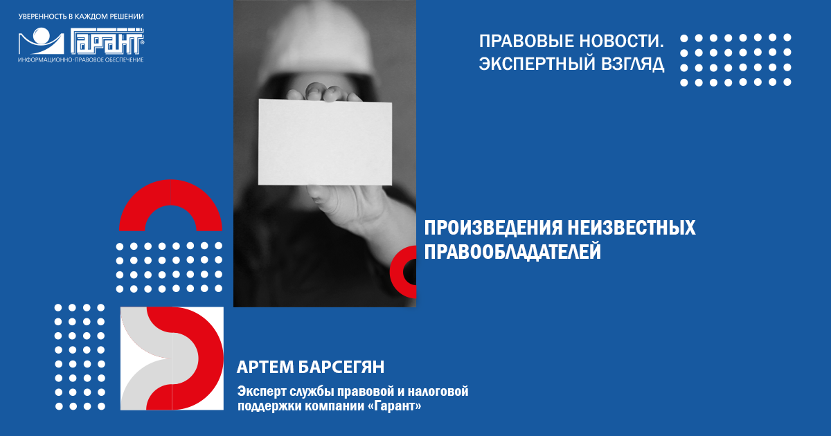 ГК РФ дополнен нормами о порядке использовании произведений, правообладатели которых неизвестны, либо неизвестно их место нахождения или жительства. Аккредитованная организация по коллективному управлению правами предоставляет право использования таких произведений заинтересованным лицам на основании лицензионного договора. Денежные средства, уплаченные за использование этих произведений, зачисляются на специальный номинальный счет. Обзор подготовил эксперт службы Правового консалтинга ГАРАНТ Артём Барсегян.
