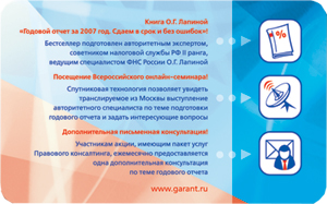 Кроме того, предлагаем ознакомиться с бизнес-справкой "Годовой отчет - 2007. Налоговый учет и отчетность в 2008 году. Правовая поддержка от системы ГАРАНТ". Вы получите неоценимую помощь в подготовке годового отчета и познакомитесь с Перечнем действующих форм бухгалтерской и налоговой отчетности, а также с формами годовой бухгалтерской отчетности бюджетных организаций, банковских организаций, страховых организаций, которые будут действовать в 2008 году.