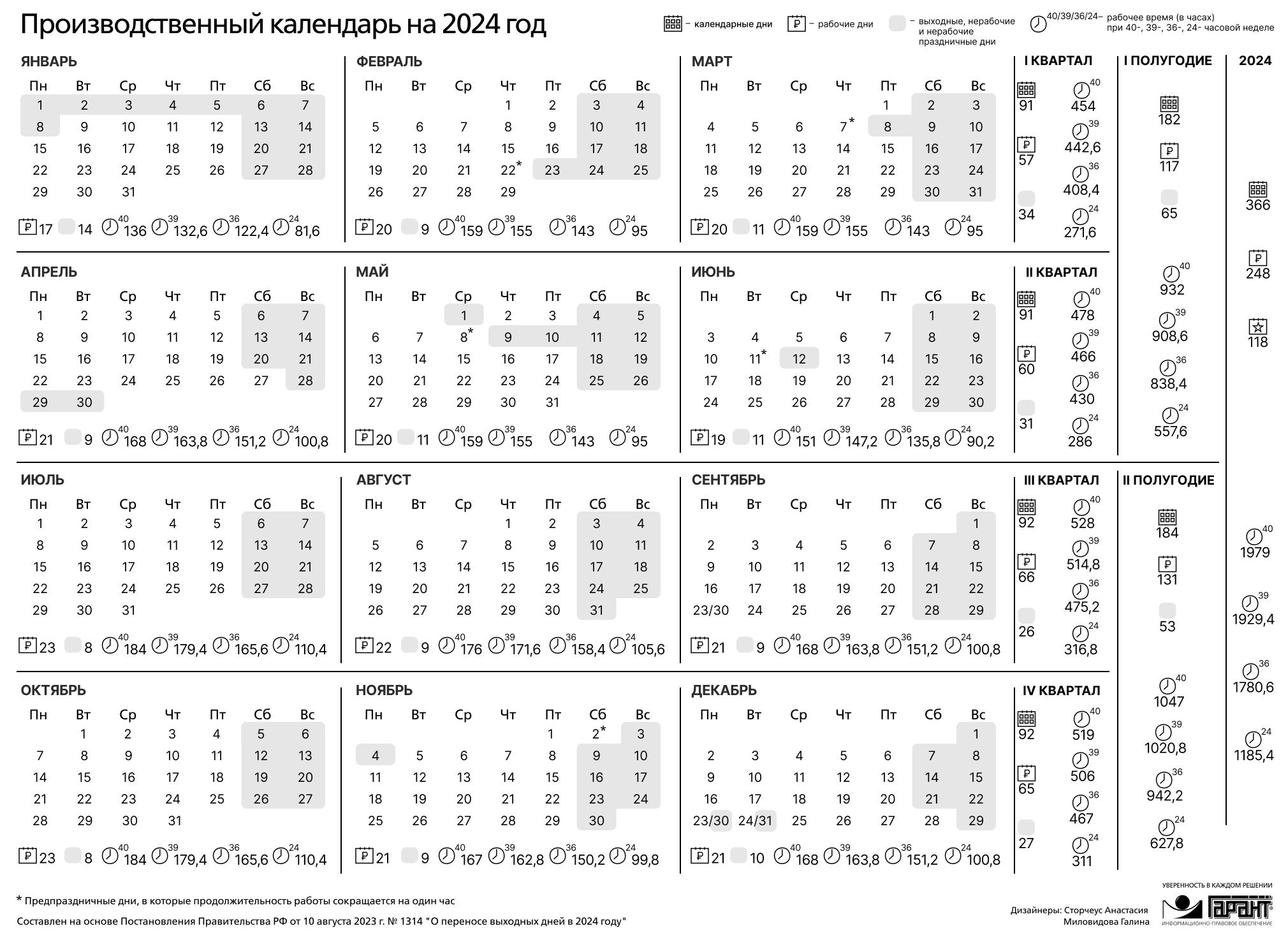 Расширенную информацию о режиме труда и отдыха в следующем году можно посмотреть в производственном календаре на 2024 год, который можно скачать и распечатать (для цветного принтера, для ч/б принтера).