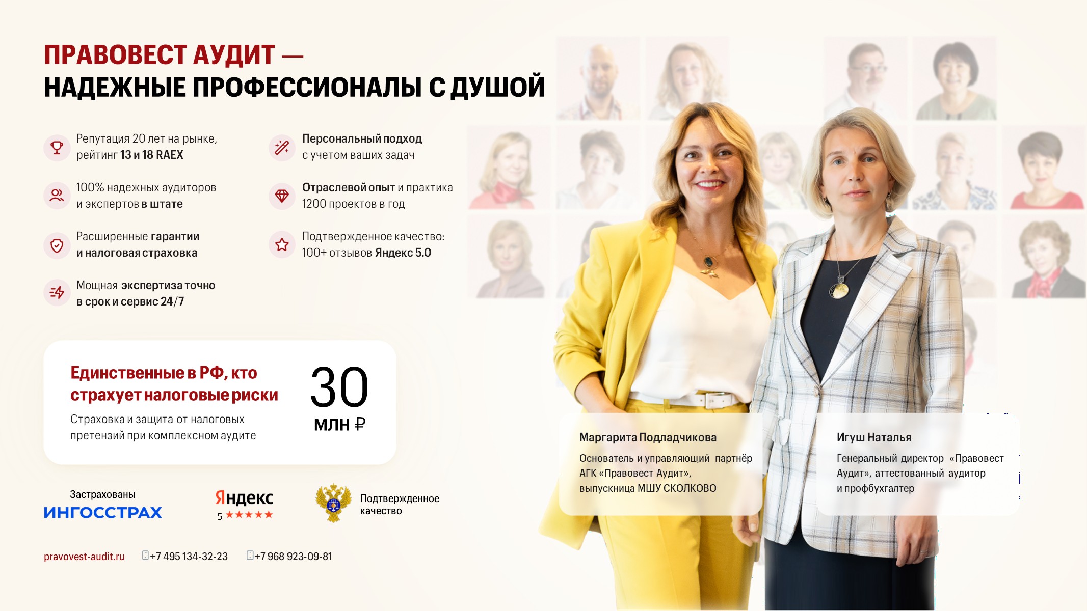 По итогам «расширенного» аудита «Правовест Аудит» выдает не только аудиторское заключение и расширенные юридические и финансовые гарантии бизнесу, но и персональный сертификат руководителю, главному бухгалтеру о прохождении аудита. С учетом серьезных личных рисков рекомендуем хранить его и при необходимости он подтвердит квалификацию и соблюдение законодательства в части ведения достоверного учета и представления достоверной отчетности.