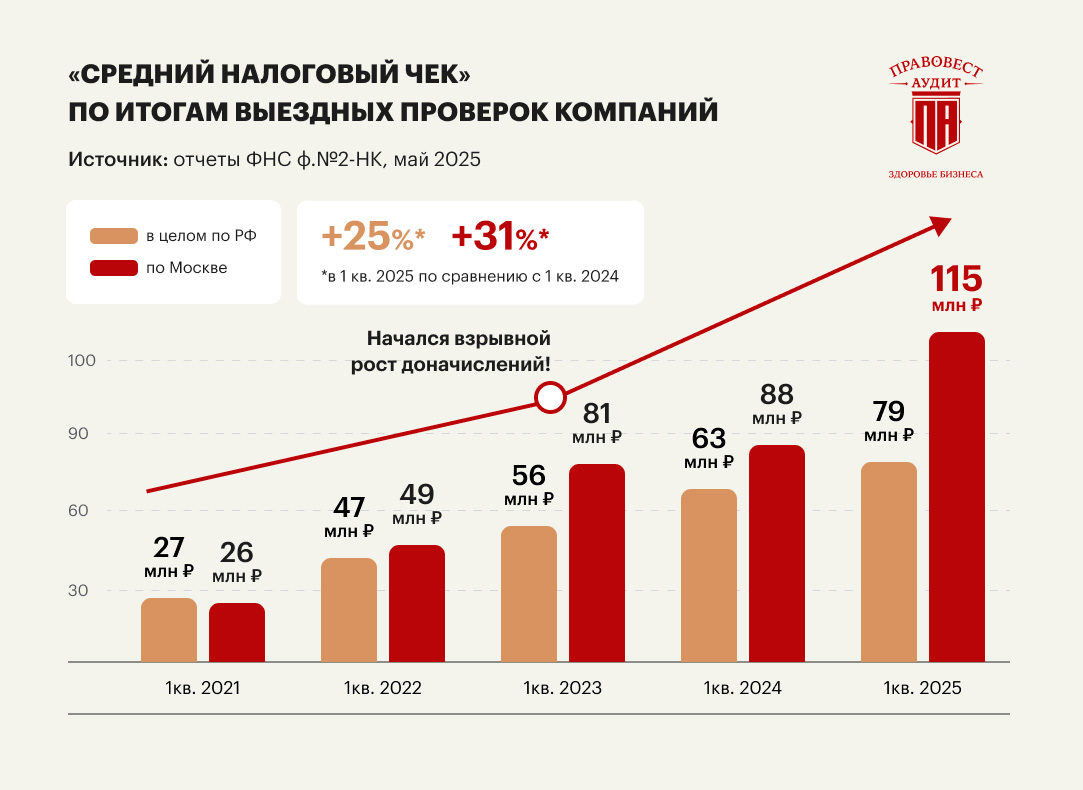 По итогам 1 квартала 2025 года средний размер налоговых доначислений по выездным проверкам компаний достиг в Москве 115млн. руб., по РФ — 79 млн. руб. (отчет ФНС ф№ .2-НК, 2025). При этом 99% выездных проверок являются результативными, т.е. завершаются с доначислениями.