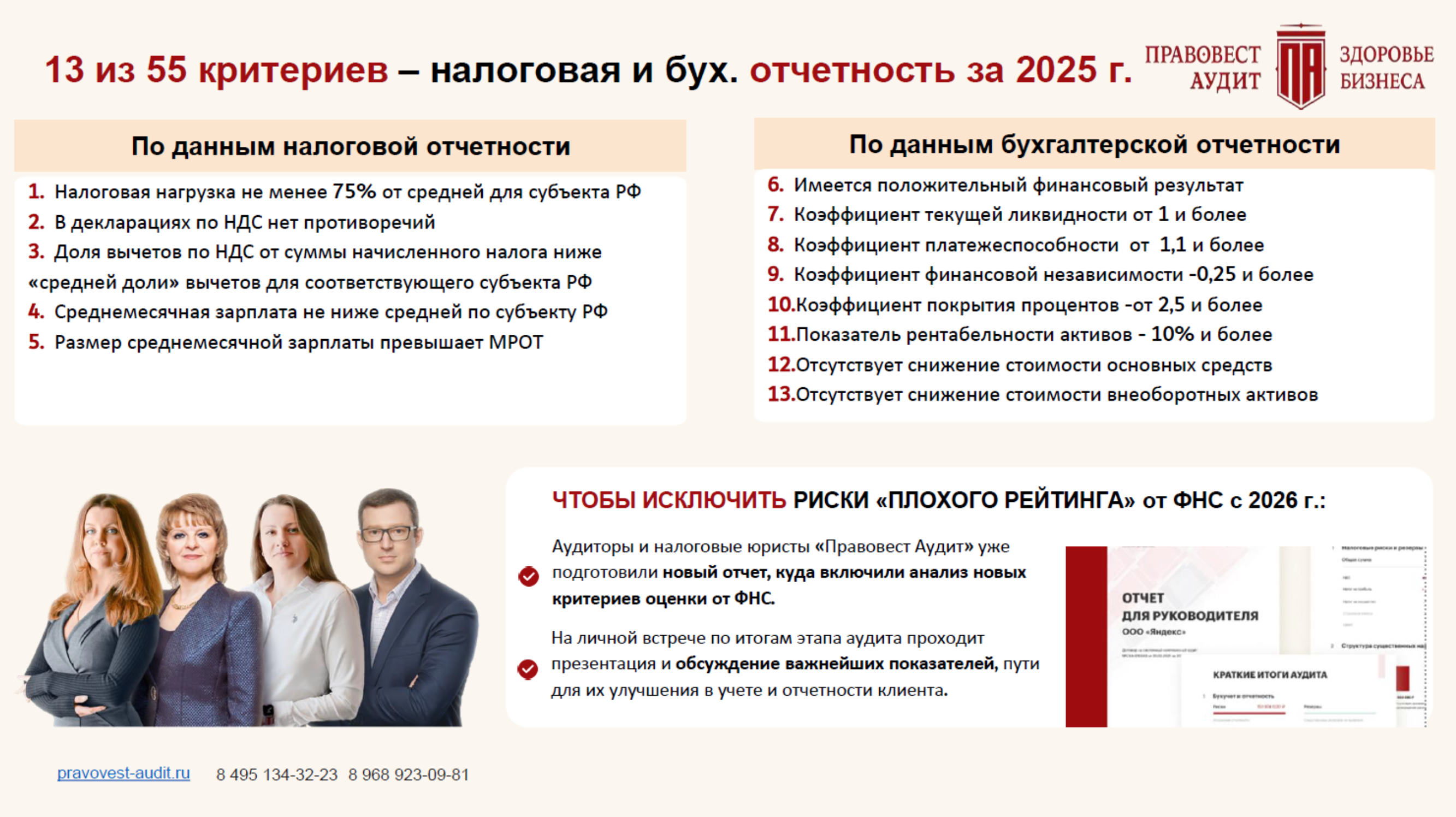 Успешную статистику ФНС пополняют те компании, которые пренебрегают профилактикой налоговых рисков, которая как раз и выпадает из «поля зрения» дешевого формального аудита. Наша аудиторская практика 2025 года показывает, что в 100% случаях организации имеют серьезные ошибки в отчетности и налогах. Т.е. риски налоговых претензий и доначислений есть у всех, важно вовремя их найти и исправить, пока не стало поздно.