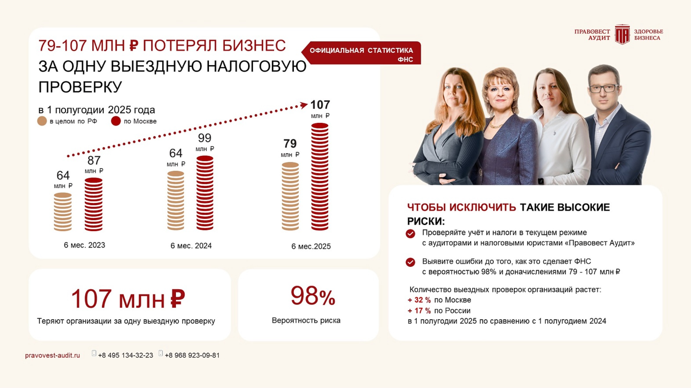 В 2025 году «средний налоговый чек» по итогам выездных проверок составляет 79 млн руб.по РФ, 107 млн руб. — по Москве, что больше 2024 года на 23% и 8% соответственно. Количество выездных проверок также растет +17% по РФ и +32% по Москве. Результативность проверок — 98%, т.е. риски доначислений существенны.