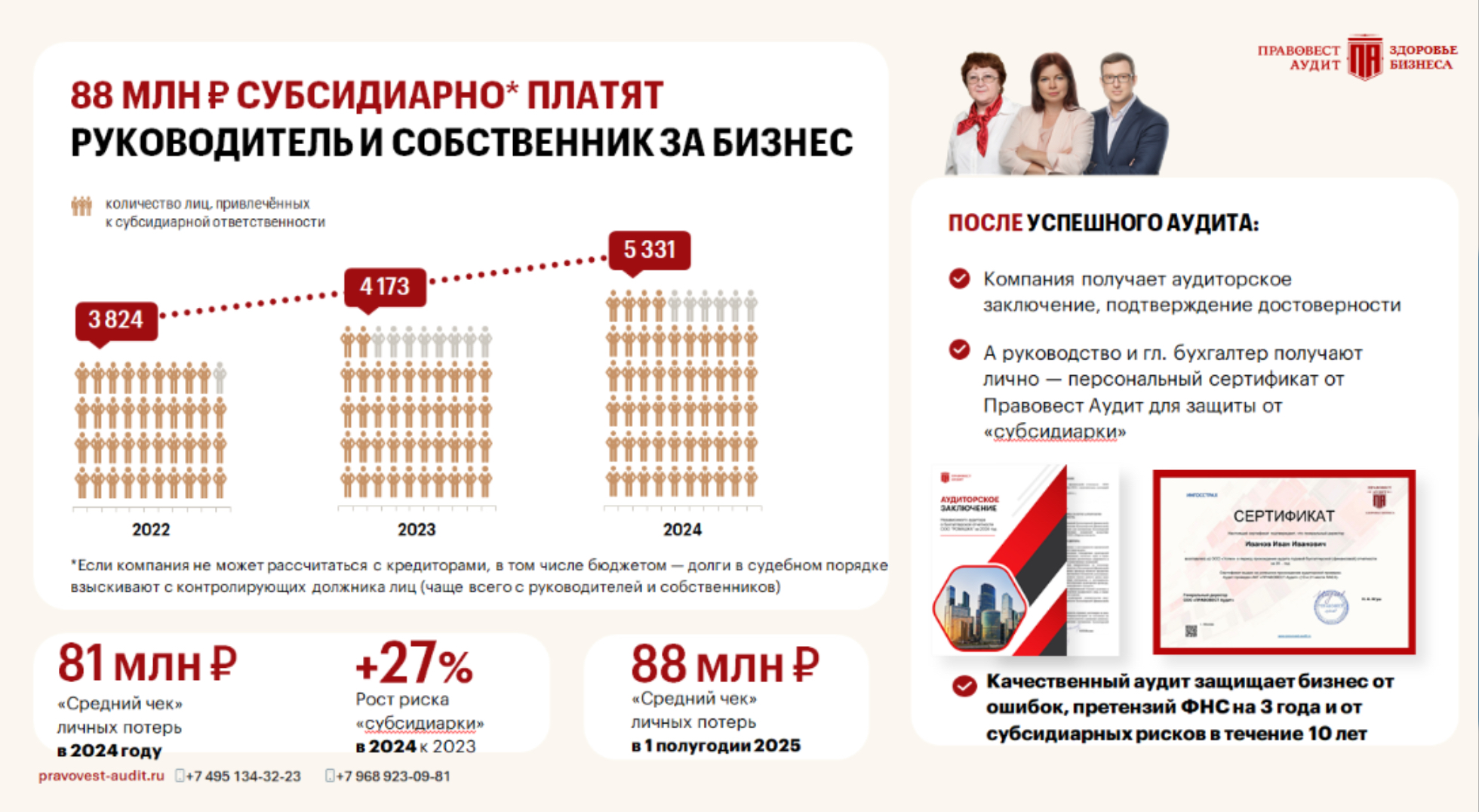 Компания «Правовест Аудит» вместе с положительным аудиторским заключением выдает Персональный сертификат руководителю — эти документы весомое доказательство добросовестности руководителя при защите от субсидиарной ответственности.