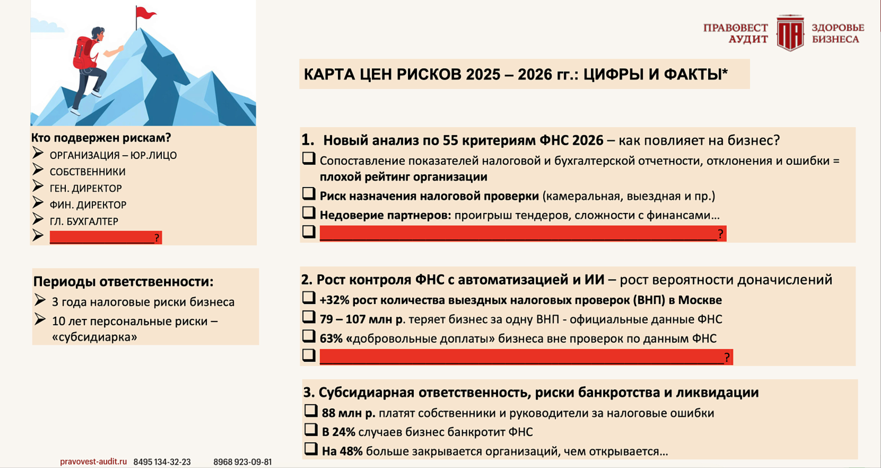 Сегодня риски для бизнеса и руководителей ощутимо выросли. Еще с 2026 года вступает в силу 254-ФЗ от 23.07.2025: анализ налоговой и бухгалтерской отчетности от ФНС будет доступен третьим лицам - низкая оценка ФНС испортит ЭКГ-рейтинг бизнеса. Как защитить не только компанию, но и собственников и руководство лично?