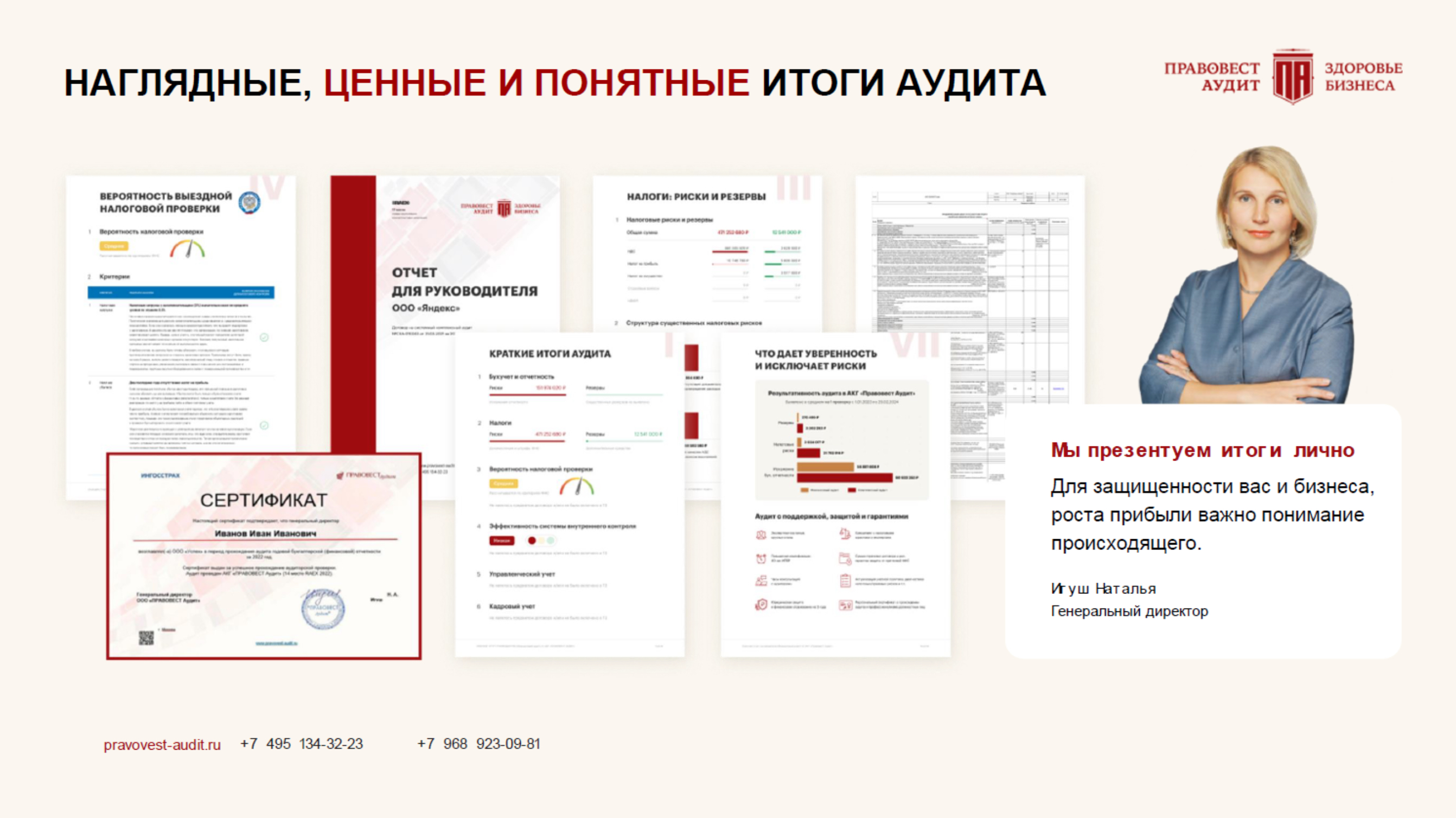 Аудиторское заключение и Отчет руководителю наглядно покажут зоны и размеры рисков, что позволит вовремя принять меры для исправления ситуации для защиты организации и себя.