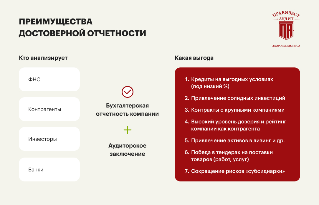 Бухгалтерская отчетность сегодня находится под пристальным вниманием ФНС, контрагентов, а в некоторых случаях еще и банков, а также инвесторов. Достоверная отчетность без ошибок, подкрепленная аудиторским заключением, дает множество преимуществ — высокий уровень доверия к компании, дешевые кредиты и многое другое.
