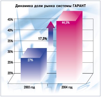 В современном, быстро меняющемся мире руководителям, юристам, бухгалтерам не обойтись без справочной правовой системы, содержащей всю необходимую в работе информацию - федеральные и региональные правовые акты, проекты законов, судебную и арбитражную практику и, конечно, консультационные материалы, включая статьи из ведущих профессиональных СМИ, книги и регулярно обновляемые энциклопедии. Отечественный рынок правовых систем ведет свою историю с начала 90-х годов и отличается высокой степенью конкуренции. Уже в начале 90-х появилось несколько компаний, которые начали создавать правовые системы и активно бороться за пользователей. Компания "Гарант" предлагала на тот момент более дорогие профессиональные решения, не делая ставку на массового пользователя. В настоящий момент рынок пользователей правовых систем существенно вырос, общее количество клиентов системы ГАРАНТ превышает 70 тысяч организаций. Если на начальных этапах развития количество документов в системах измерялось всего лишь сотнями, то теперь производители располагают информационными банками, превышающими миллион документов, и предлагают пользователю богатый выбор различных тематических информационных блоков. Если в начале 90-х пользователи довольствовались минимальными поисковыми возможностями программной оболочки и самостоятельно приезжали в офис к разработчикам за дискетами с обновлениями, то теперь лидеры рынка предлагают комплексный сервис, серьезные интранет- и интернет-решения, интеллектуальные поисковые механизмы и практически весь спектр необходимой информации. Партнерская сеть ГАРАНТ охватывает более 200 городов, в каждом из которых клиентам предоставляют весь необходимый спектр услуг. На протяжении всей истории рынка правовых систем компания "Гарант" является одним из его основных участников. По данным, опубликованным в средствах массовой информации в 2003 году, около трети организаций в своей работе использовали систему ГАРАНТ. По тем же данным, ближайший конкурент имел существенно большую долю рынка. История практически не знает примеров, когда компания, доминирующая на рынке, резко сдавала свои позиции. Но, как оказалось, точка в конкурентной борьбе еще не поставлена. В период с марта по апрель 2004 года независимый исследовательский центр РОМИР Мониторинг провел новое исследование, которое показало существенное изменение сил на рынке. Доля компаний, использующих в работе СПС ГАРАНТ, выросла до 44,5%, причем доля рынка основного конкурента сократилась более чем на 10%. Исследование РОМИР Мониторинг проводилось в Москве и 16 крупнейших регионах России. В исследовании приняли участие руководители, бухгалтеры и юристы из 7200 организаций, результаты исследования репрезентативны для организаций России, предельно допустимая погрешность результатов составляет 1,2%. Указанная точность измерения позволяет сделать вывод, что изменение соотношения на рынке никак нельзя объяснить погрешностью измерения. Расклад сил действительно изменился. По мнению директора компании "Гарант", Дмитрия Першеева, данные результаты не стали неожиданностью для его компании. "Гарант" не первый год демонстрирует положительную динамику бизнеса. Согласно данным ВЦИОМ в Москве уже в 2003 году более половины пользователей справочных правовых систем (52% рынка) использо