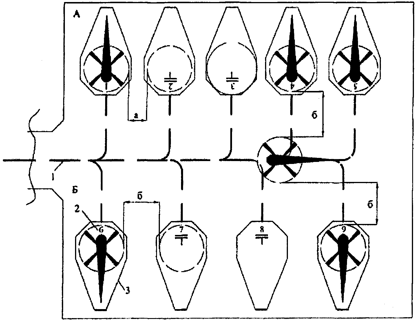 Б - при буксировке на тяге несущего винта (расстояние "б" должно быть не менее 0,5 диаметра несущего винта);