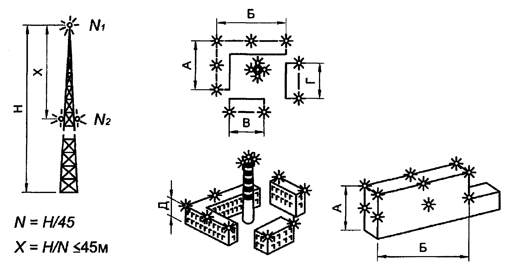 Размеры А, Б равны 45 - 90 м; В, Г, Д меньше или равны 45 м.