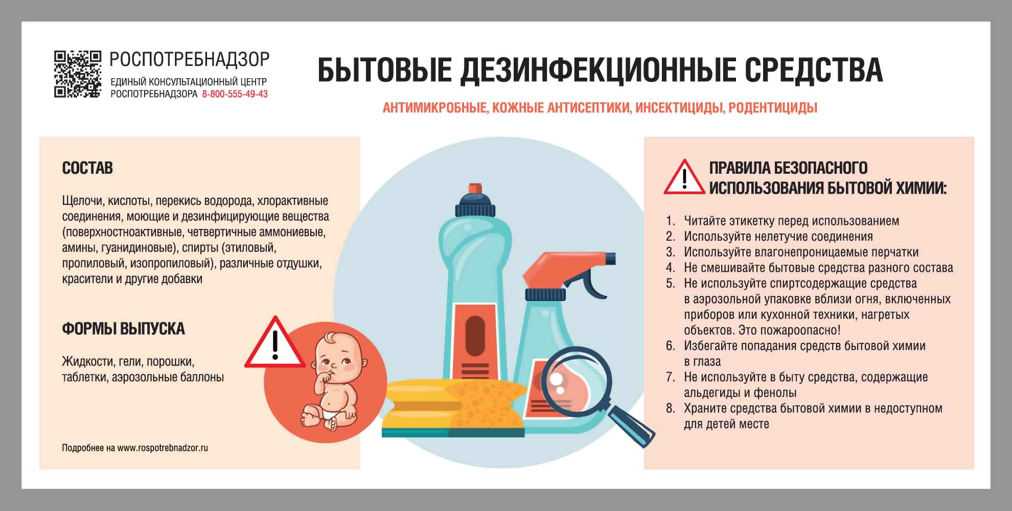 Роспотребнадзор выпустил рекомендации по безопасному применению в быту моющих и дезинфицирующих средств. В частности, следует обращать внимание на химический состав, назначение средств, условия применения и хранения, меры предосторожности. Нельзя самостоятельно смешивать бытовые средства разного состава. Спиртосодержащие средства пожароопасны. Не разрешены для использования в быту средства, содержащие альдегиды и фенолы. При применении средств следует беречь глаза и руки.