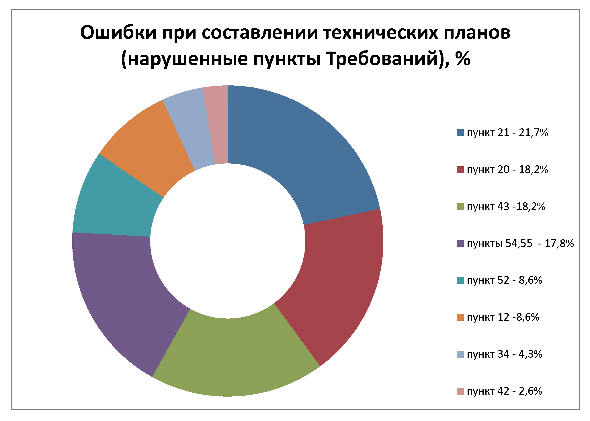 | Форма и (или) содержание документа, представленного для осуществления государственного кадастрового учета (в том числе в рамках единой учетно-регистрационной процедуры), не соответствуют требованиям законодательства Российской Федерации (пункт 7 части 1 статьи 26 Закона о регистрации). | Нарушения, связанные с качеством подготовки технического плана. Наиболее часто нарушаются следующие пункты Требований: 1. пункт 21. Представленные для государственного кадастрового учета технические планы в форме электронного документа содержат нарушения Требований, наличие которых не обеспечивает считывание XML-документа: - в XML-схеме формата GKUOKS_.xml технического плана неправильно заполнен элемент "CadastralBlock" (для объектов недвижимости, учтенных в кадастровом округе "Общероссийский", части кадастрового номера, соответствующие номеру кадастрового округа, номеру кадастрового района, номеру кадастрового квартала - строго нули, разделенные двоеточиями 0:0:0:. (пункт 4.2. главы 4 "Общие требования к заполнению технического плана в формате XML" Приказа N П/0163); - отсутствует обязательный элемент "Contours", который заполняется в отношении каждой части линейного сооружения, расположенной в определенном кадастровом округе (условной части линейного сооружения) (главs 5.3.2, 5.3.3# Приказа N П/0163); - некорректно указан (выбран) код системы координат (элемент "CsCode"), а также неверно указано наименование системы координат (элемент "EntitySpatial Name") в связи с чем контур линейного сооружения определяется на дежурной кадастровой карте вне пределов кадастровых округов, на территории которых оно фактически располагается; - не присвоен новый GUID при повторной подаче технического плана (необходимо присвоить новый GUID, даже если сведения технического плана не изменялись (пункт 4.4. главы 4 Приказа N П/0163); технический план линейного сооружения, состоящий из набора файлов, упакованных в один ZIP-архив представляется без уникального набора символов, соответствующего GUID, указанного в XML-файле (TP/@GUID). Данная ошибка (об отсутствии уникального набора символов, соответствующего GUID) также встречается при представлении Акта обследования (XML-схема, используемая для формирования XML-документа - акта обследования, подтверждающего прекращение существования объекта недвижимости, в форме электронного документа, утверждена приказом Росреестра от 30.09.2014 N П/456 "Об организации работ по предоставлению в орган кадастрового учета документа, необходимого для снятия с государственного кадастрового учета объекта недвижимого имущества, в виде акта обследования, подтверждающего прекращение существования объекта недвижимости, в форме электронного документа"). Поскольку технические планы в силу вышеупомянутых причин невозможно загрузить в ЕГРН, установить из каких конструктивных элементов состоит контур линейного сооружения и, как следствие, оценить файл (файлы) Схемы расположения линейного сооружения на земельном участке (далее - Схема) на предмет отображения контуров специальными условными знаками, в рамках проведения экспертизы, предусмотренной статьей 29 Закона о регистрации, также не представляется возможным. 2. пункт 20. Сведения о характеристиках линейного сооружения (например, протяженности), указанные в техническом плане, не соответствуют сведениям о характеристиках сооружения, содержащимся в доку