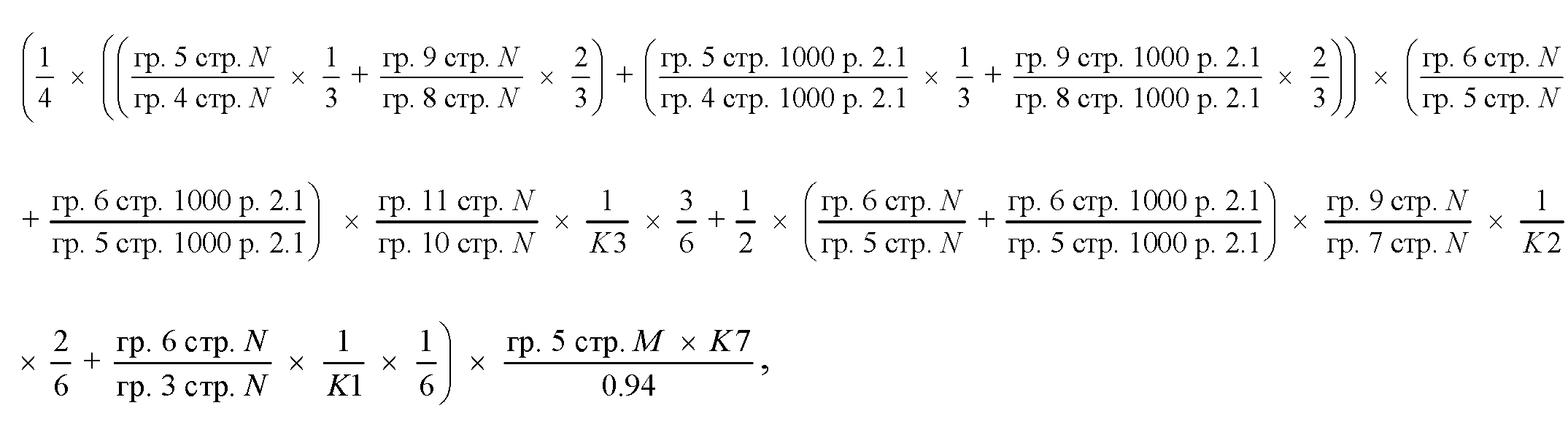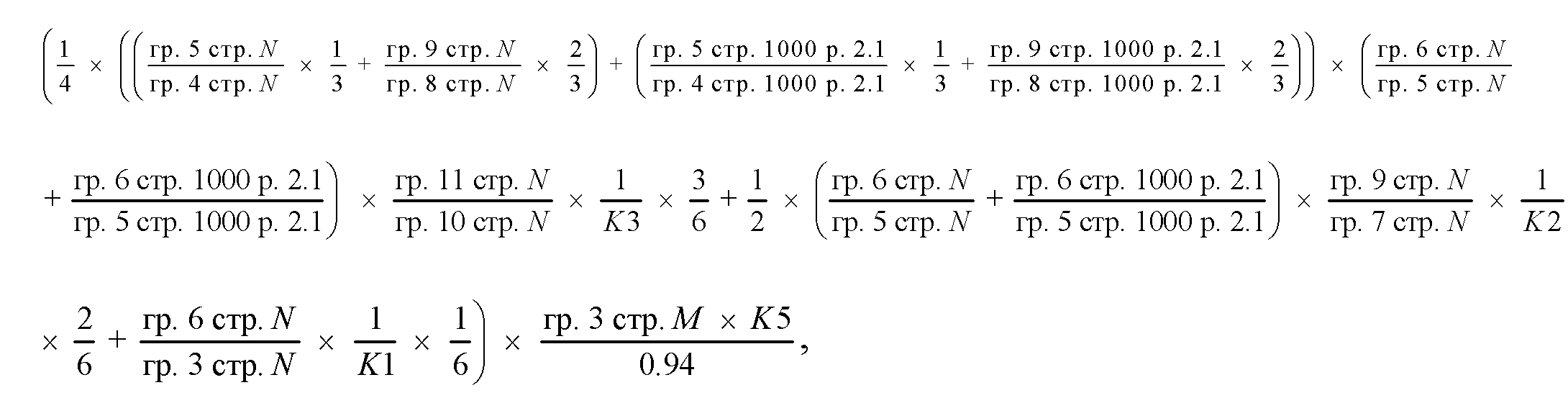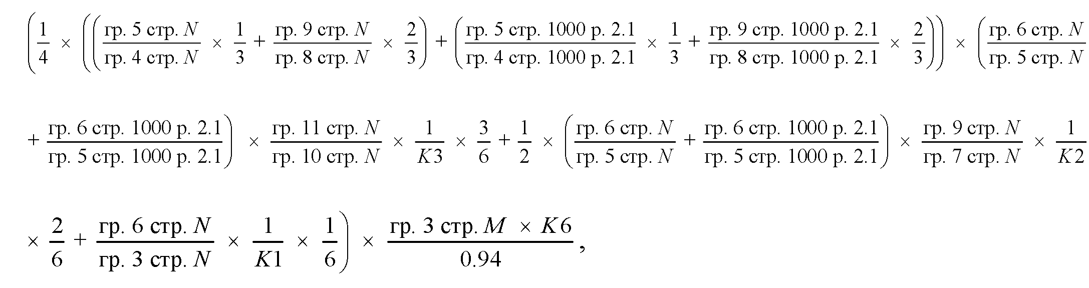 графа 10 по строкам за исключением строки 900 - произведение значения графы 5 подраздела 3.1.1.1 раздела 3 по соответствующему субъекту Российской Федерации и суммы значений первого слагаемого (рассчитываемого как произведение значения графы 3 подраздела 3.1.1.1 раздела 3 и значения графы 7 по строке 900 подраздела 3.1.1.1 раздела 3), второго слагаемого (равного значению графы 6 подраздела 3.1.1.1 раздела 3) и третьего слагаемого (рассчитываемого как произведение значения графы 4 подраздела 3.1.1.1 раздела 3 и значения графы 8 по строке 900 подраздела 3.1.1.1 раздела 3) по соответствующим строкам;