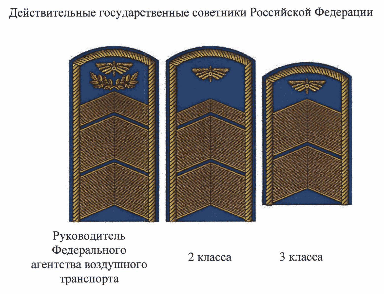 "Нашивные наплечные знаки различия (рис. 20, 21) предназначены для ношения на пальто, тужурке, жакете и представляют собой четырехугольники с закругленным верхним краем длиной 11-13,5 см, шириной 7 см. На знаках на расстоянии 0,3 см от края с трех сторон (кроме нижней) нашивается металлический галун золотистого цвета шириной 0,5 см. У Министра, заместителя Министра, государственных гражданских служащих, имеющих классные чины высшей и главной групп должностей, вместо галуна делается вышивка. На расстоянии 1,5 см от верхнего края наплечного знака располагается малая эмблема Росавиации размером 40 х 15 мм: вышитая - у государственных гражданских служащих, имеющих классные чины высшей и главной групп должностей, или металлическая - у остальных работников. На пришивных наплечных знаках руководителя Федерального агентства воздушного транспорта низ эмблемы обрамлен шитьем в виде лаврово-дубового венка.";