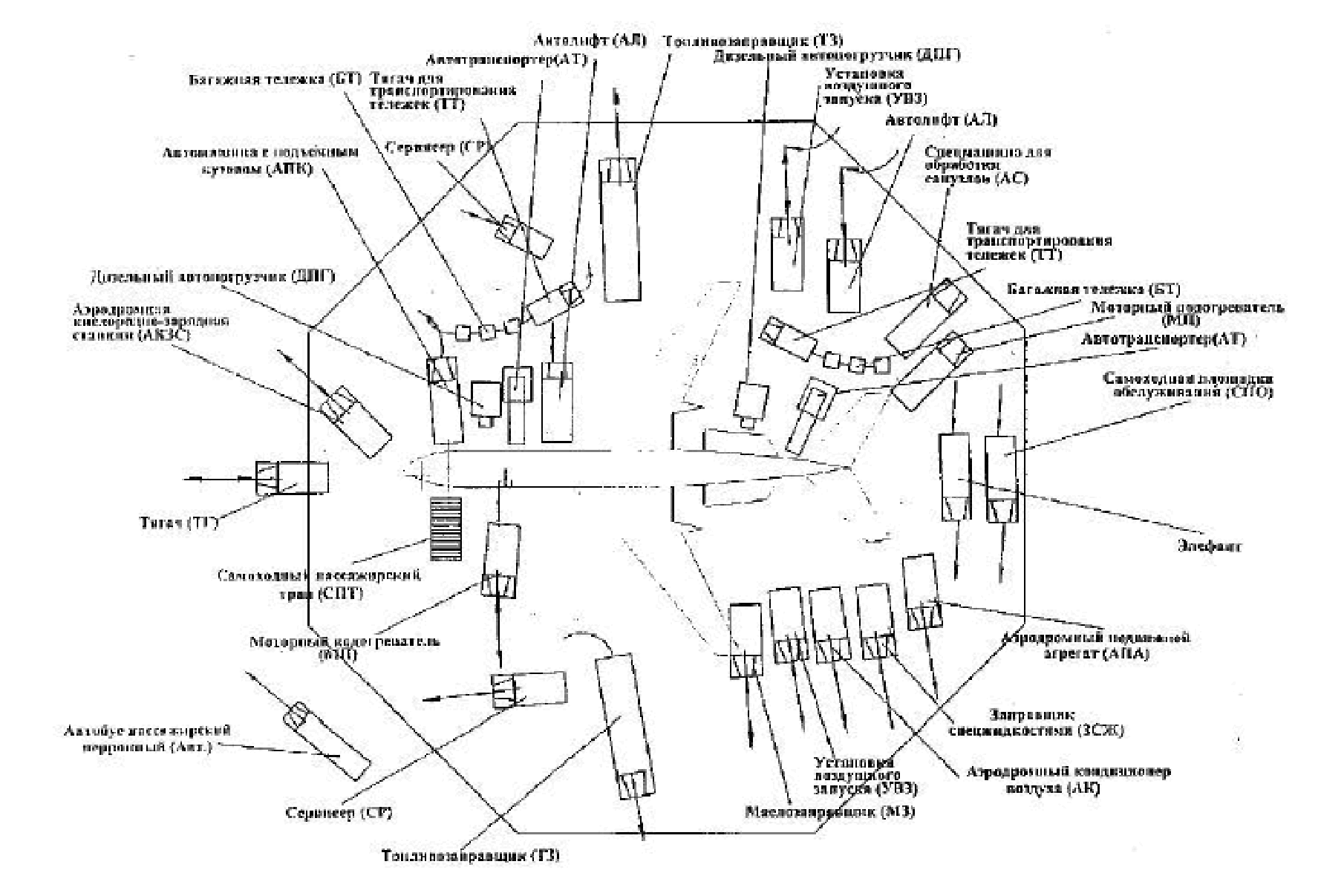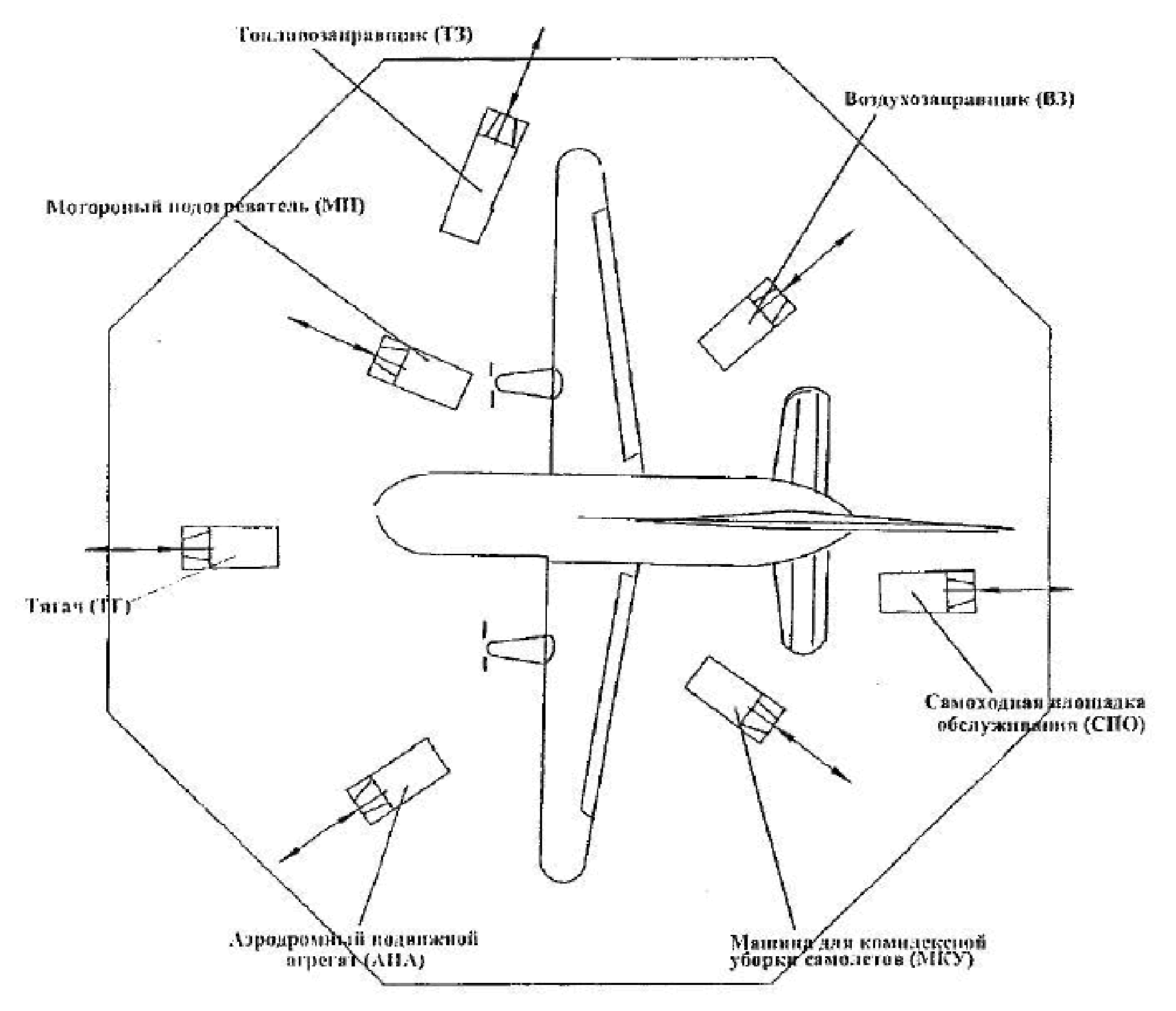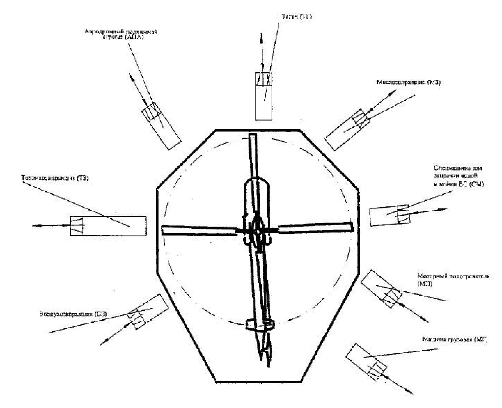 3. Схема расстановки и организации движения воздушных судов, спецтранспорта и средств механизации на аэродроме вывешивается в местах стоянок спецмашин, в классах служб главного оператора аэропорта и организаций, осуществляющих эксплуатацию спецмашин.